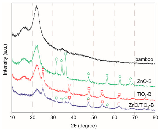 XRD patterns of pristine bamboo, ZnO-B, TiO2-B and ZnO/TiO2-B.