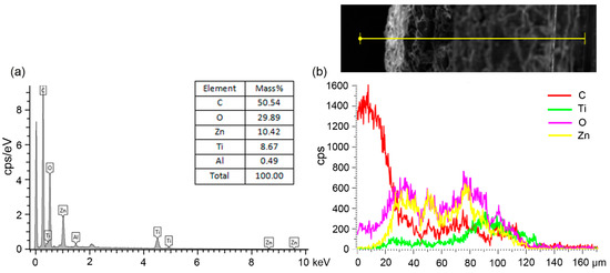 (a) EDS spectra of the ZnO/TiO2-B and the content of each element (inset); and (b) SEM in the line scanning mode and the element distribution across the ZnO-TiO2 coating.