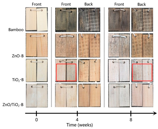 Bamboo is easily degraded when directly exposed outdoors because of the organic nature of bamboo and the complex environmental conditions. The relevant research demonstrated that the optimum temperature for fungal growth is 5–30 °C, while the optimal humidity is above 63% [26]. The temperature and weather during the test period are presented in Figure 4a. As shown, the weather was mainly cloudy or rainy because of the upcoming rainy season in Hangzhou. The rainy season is very suitable for the growth of fungi. The results of the antifungal evaluation are summarized in Figure 4b. The photographs (front and back) of the samples after four weeks and eight weeks of the test are exhibited in Figure 5. Obviously, the pristine bamboo exhibited poor resistance to fungal growth, with fungi having grown after one week of being exposed outdoors. Furthermore, the infected area reached 100% after four weeks of the test. As shown in the photographs, the pristine bamboo surface was only severely degraded after four weeks of exposure. By contrast, ZnO-B and TiO2-B showed weak resistance to fungal growth. Fungi began to grow on ZnO-B during the third week and covered the entire surface after six weeks. For TiO2-B, there were significant differences between growth on the front and the back as the fungi grew more easily on the back than on the front of the samples. After the two-month test, the face infection value of the front of TiO2-B was 43%, but the back reached 79%. The possible reason is that the back could not receive direct sunlight and the front of TiO2-B produced more ROS in the presence of light. As expected, ZnO/TiO2-B had an improved antifungal property as there were no visible fungi growth on both sides of the samples until the end of test.