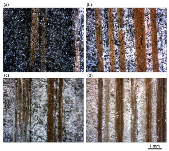 Optical microscope pictures after the two-month test period for (a) pristine bamboo; (b) ZnO-B; (c) TiO2-B; and (d) ZnO/TiO2-B, respectively.