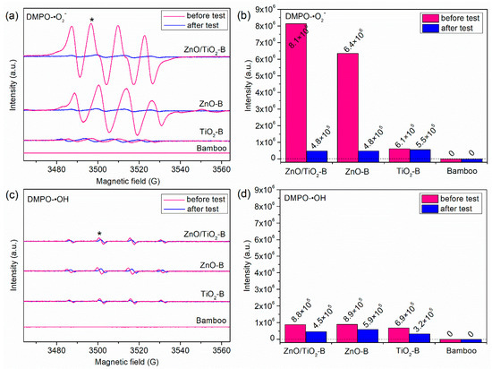 It is known that ROS have the ability to attack the crucial organic components of fungi and cause their death [27]. To identify the mechanism behind the improved antifungal property, the ESR spin-trap technique (with DMPO) was carried out to determine the photogenerated ROS from the surface of samples under visible light irradiation (λ > 420 nm). The ESR spectra of DMPO-•O2− and DMPO-•OH are shown in Figure 7a,c. The characteristic peak with an intensity ratio of 1:2:2:1 were clearly observed. Due to the overall poor signal/noise ratio in certain samples, the quantitative analysis was performed by the highest signal/noise ratio in the 1:2:2:1 quartet profile, the quantified intensity of the second peak of the radical species (marked by the “*”) are summarized in Figure 7b,d. Before the test, the characteristic signals intensity of the DMPO-•O2− for the samples were ZnO/TiO2-B > ZnO-B > TiO2-B. This revealed that ZnO/TiO2-B produced a greater amount of •O2− than ZnO-B and TiO2-B under visible light irradiation [28,29,30]. There were no noticeable signals detected in pristine bamboo, which indicated that •O2− could not be produced from pristine bamboo. For the ESR spectra of DMPO-•OH, under visible light irradiation, the characteristic signals intensity for ZnO/TiO2-B, ZnO-B and TiO2-B were basically the same. It demonstrated that this large quantity of •O2− compared to •OH is considered to be mainly responsible for the inactivation of fungi. Therefore, ZnO/TiO2-B had an improved antifungal property than ZnO-B and TiO2-B because more •O2− was produced by ZnO/TiO2-B.