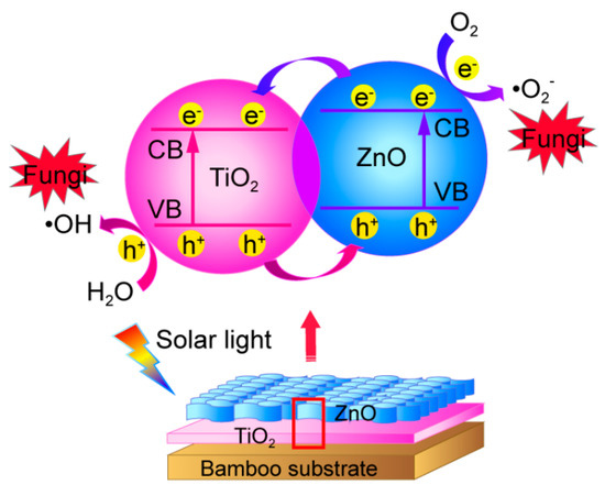 Among the various photocatalytic nanomaterials, titanium dioxide (TiO2) and zinc oxide (ZnO) have received increasing attention because of their high chemical stability, nontoxicity, relatively low cost and high photocatalytic efficiency [17]. Several reports have demonstrated that ZnO-TiO2 composites were quite effective when used as a photocatalyst [18,19,20,21,22], while the antifungal properties of bamboo modified with ZnO-TiO2 nanocomposites have not been explored under solar light irradiation. Inspired by this, using the two nanomaterials to cover the bamboo substrate may improve the antifungal property in a natural environment and provide a flame-retardant property.