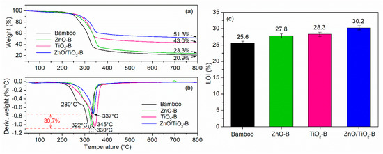(a) TG curves; (b) DTA curves; and (c) LOIs of pristine bamboo, ZnO-B, TiO2-B and ZnO/TiO2-B.