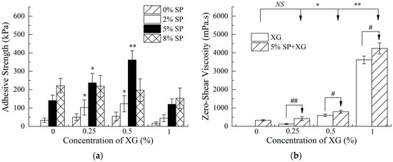 Previous studies have shown that SP and XG were typical shear thinning fluids that showed non-Newtonian behaviors. SP has pseudoplasticity and high viscosity near zero-shear force. As the shear force increases, the solution becomes thinner and the viscosity decreases [45]. In addition, viscosity is an important property that regulates the adhesion behavior and performance. Our previous results indicated that there was a significant positive correlation between the adhesion strength and zero-shear viscosity in SP adhesives when sodium carboxymethyl cellulose was used as a modifying reagent [39]. Our current study showed that the addition of 0.5% XG significantly improved the zero-shear viscosity of the SP adhesive (p < 0.05), which led to an increase in the bond strength between the SP adhesive and bones (Figure 1b). However, there was a gelatinization phenomenon in the SP adhesive when 1% XG was added. Although the zero-shear viscosity of the SP adhesive increased sharply, the adhesion between the SP and bones was still decreased.