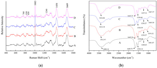 Raman (a) and Fourier transform infrared (FTIR) (b) spectra of SP adhesives with different concentrations of XG. (A) 5% SP only; (B) 5% SP + 0.25% XG; (C) 5% SP + 0.5% XG; (D) 5% SP + 1% XG.