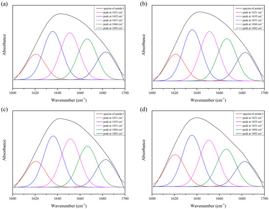 Original spectrum (black) and curve-fitting spectra of amide I for SP adhesives with different concentration of XG. (a) 5% SP only; (b) 5% SP + 0.25% XG; (c) 5% SP + 0.5% XG; (d) 5% SP + 1% XG.