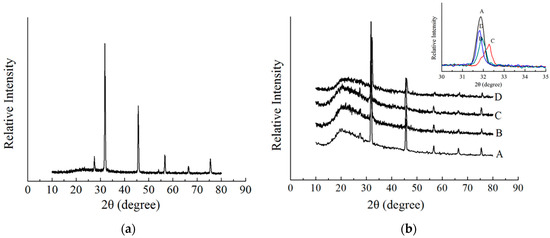 XRD analysis provides a clue regarding the crystallinity of SP in SP adhesives with XG-blend microspheres to understand the compatibility of blends. Typical XRD spectra of pure XG (a), SP, and SP-XG (b) were showed in the Figure 4. The diffraction peaks of the XG crystal plane were at 2θ, which equaled to 28°, 32°, 46°, 57°, 66°, and 75°, respectively, whereas for SP adhesives in the presence of XG, the diffraction peak at 2θ = 28° was not observed and the intensity of the peak at 2θ = 32° was decreased (Figure 4b insert Curves B and C), indicating good miscibility and interactions between XG and the SP molecules. At a relative high concentration (ex. 0.5%), XG addition interfered with the arrangement of protein molecular chains in the SP adhesive, facilitating the unfolding of polypeptide chains, which led to a structure that was more amorphous and less crystallized. Li et al. found that the addition of Arabic gum could decrease the crystallinity of peanut protein isolate, promote the unfolding of protein structures, and facilitate the protein-polysaccharide interaction by interfering with the protein chain arrangement [57]. Moreover, with the addition of 0.5% XG, the diffraction peaks were shifted to large angles (high theta values) (Figure 4b insert). Based on Bragg’s law, with the increase of scattering angle, the interplanar distance was decreased, indicating the changes in the SP structure and the unfolding of SP. These results confirmed the analysis of the Raman and FTIR results discussed above, that is, XG addition changed the protein secondary structure of SP adhesives, and the protein molecular structures tended to be unfolded, which favored the interactions between XG and SP molecules and good miscibility of XG and SP. However, when the concentration of XG was up to 1%, the diffraction peak shifted back to a smaller angle (a low theta value) and the intensity of the crystallization zone at 2θ = 32° increased (Figure 4b insert), suggesting that the presence of XG at high concentrations could cause an increase in the interplanar distance and the crystallinity. A previous study showed that there is a negative correlation between adhesive property and crystallinity [58]. Therefore, the bond strength of SP adhesives first increased with the increase of XG concentration and then decreased after reaching a peak.