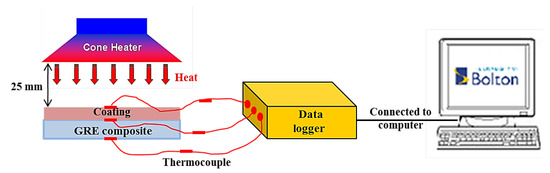 Experimental setup for temperature profile measurements in intumescent coated glass fibre-reinforced epoxy (GRE) composites during cone experiment at 50 kW/m2.