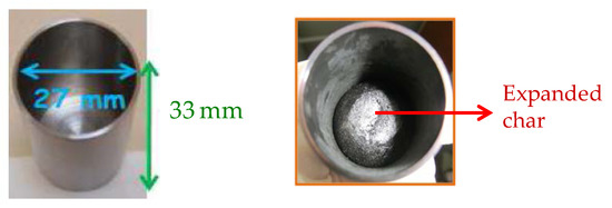 An advanced rheometric expansion system (ARES 20A, Rheometric Scientific, New Castle, DE, USA) with a cylindrical sample holder (Figure 2) was used to evaluate the char expansion of the intumescent coatings as a function of temperature. The coating sample of a circular shape (disc) with 25 mm diameter and of 1 mm thickness was tested in a cylindrical sample holder of 27 mm diameter and 33 mm height to allow for char expansion as shown in Figure 2. All tests were performed under dynamic temperature ramp from 25 to 500 °C in strain-controlled mode over 1.5–3.0 gmf force range with 5 and 10 °C/min heating rates, 1.0 rad/s frequency range and 1% strain limits. Three replicate specimens of each coating were tested and the results were averaged.