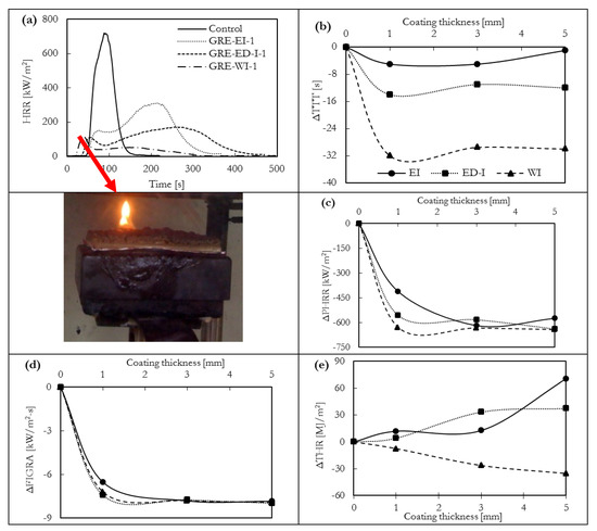 The effect of the thickness of all the coatings is better observed from Figure 4b–e where Δ parameters of TTI, PHRR, THR and FHI are plotted as a function of coatings thickness. The expression Δ parameter is taken as difference in the particular parameter (TTI, PHRR etc.) of the coated sample and the control sample. The results in Figure 4b show that the coating thickness of each coating has a minimal effect on TTI. PHRR however decreased from 1 to 3 mm coating and was not further affected by increasing coating thickness to 5 mm. This behaviour can be explained by the fact that when expanded char becomes very thick, it gets closer to the cone heater and hence, the incident heat flux gets higher than that for the sample kept at 25mm distance in the cone experiment. Similar trend is observed for FHI values (Figure 4c,d). The THR values increased at respective coating thicknesses, except for WI, which significantly decreased from 1 to 5 mm coating as clearly seen in Figure 4e.