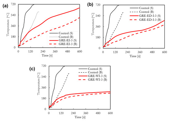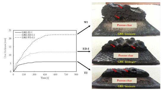 In a laminate, when the temperature reaches the softening or the glass transition temperature (Tg) of the epoxy resin, mechanical properties of the laminate are lost [2,16,21]. As an effective thermal barrier protection, the coating should stop or retard the temperature rise at the surface to reach Tg or the pyrolysis temperature (the temperature at which decomposition of the resin starts) of the epoxy resin. The Tg of the resin used in this work is 180 °C. The results showed (for 3 mm thick coatings, see Figure 5 that within 120 s, the surface temperature of all the coated samples has already reached the glass transition temperature of the resin (180 °C), except for the back surface temperatures which required a longer time, that is, >180 s. As can be seen from Table 1 the surface temperature of control sample reaches the glass transition temperature within 28 s. When the samples are protected by a 1 mm thick coating, there is no significant delay in time (32–38 s) to reach 180 °C. That means with the 1 mm coatings of GRE-EI, GRE-ED-I and GRE-WI, the GRE composite will start losing its mechanical properties in short period of time after exposure to a high heat source and are not very effective. However, a 3 mm thick coating significantly delayed the time taken to reach 180 °C by 65–110 s. For 5 mm coatings, the time was increased to over 300 s for EI and ED-I coatings, whilst for the WI the time was 353 s, which is not much different than that for the 3 mm thick coating. A similar effect is seen for the time required to reach the pyrolysis temperature of the resin (250 °C) on the surface for all coated samples. Among 3 mm thick coatings, GRE-WI-3 shows the longest time (223 s) and all 5 mm thick coatings are effective and take >470 s to reach 250 °C compared to 37 s in control sample. Coatings of ≥ 3 mm thickness could provide longer time to retain the mechanical properties.