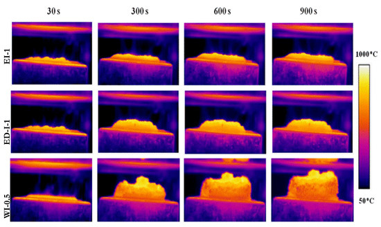 As can be seen from Figure 6, both EI and ED-I coatings started expanding immediately and rate of expansion was very high until 80 s, after which expansion was slower and became constant after 300 s. For the WI coating, the char kept expanding until 450 s and then stopped. The images of the chars obtained at the end of experiments in Figure 6 show the porous structure of the intumescent chars. The expansion process can also be clearly seen in Figure 7 with a sequence of infrared images taken during the formation of an intumescent char under a mass loss calorimeter. Based on these results, the WI coating showed highest char expansion and most porous char compared to other two coatings. The char expansion of three intumescent coatings can be ranked from high to low as: WI > ED-I > EI