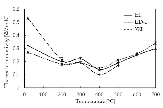 The thermal conductivity (k) values of EI, ED-I and WI coatings with 1 mm thickness were determined at both room temperature and elevated temperatures using the hot disk method. The observed thermal conductivity values at every 100 °C from room temperature up to 700 °C are reported in Table 4 and graphically plotted in Figure 9.