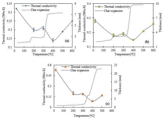 The relationship between char expansion and thermal conductivity values vs. temperature of (a) EI, (b) ED-I and (c) WI.