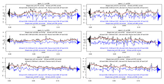 As it has been shown above (see also a review in [21]), the crucial assumption of many models of contact is that the surface roughness is Gaussian. Hence, it is important to check if the height distribution of the tested surfaces follow the normal distribution. A large number of methods for testing for normality [46] has been developed. Each normality test is based on a particular test statistic that is used to give a quantitative estimation of proximity between an observed sample of measurements and the theoretical normal distribution. The assumption of normality is especially critical when characteristics of roughness profiles are derived. The main methods for testing for normality are the following tests: Kolmogorov–Smirnov (KS), Lilliefors (LF), Shapiro–Wilk (SW), Anderson–Darling (AD), Cramer–von Mises (CVM), the Pearson, and Shapiro–Francia (SF). Using the test statistic, each of the above tests produces a numerical characteristic that is called the p-value. This number characterizes the significance at the scale [ 0 , 1 ] that the hypothesis of the normality is true for the observed measurements. One can nominate the acceptable significance level, say 5%. If the p-value is less than this level, then the hypothesis of normality should be rejected. Alternatively, if the number is within the significance level, then one can conclude that the height distribution is normal. Note that the acceptable significance level is a probability to reject the hypothesis of normality even if it is true.