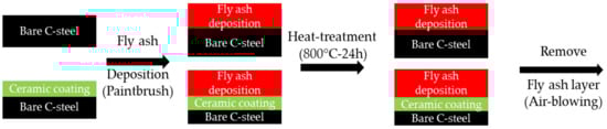 The anti-fouling performance of the developed coating against fly ash was studied. To study the anti-fouling ability of the coating, the slurry containing ash was used to observe the ash attachment on the coating surface. To do this, coated and non-coated steel plates were immersed in the fly ash solution and then dried at 50 °C for 1 h. After 24 h of sintering in the box furnace at 800 °C for 24 h, the specimens were cooled to room temperature (20–25 °C). A compressed air gun (0.5 MPa) was then used to blow the fly ash powder-deposited surface of each specimen for 1 min. The air gun nozzle was placed 20 cm away from the specimens. Subsequently, the air-blown specimens were examined with SEM-EDS. Figure 1 shows the entire experimental process. In addition, the prepared composite coatings were applied to a real-life boiler system to assess their effectiveness.