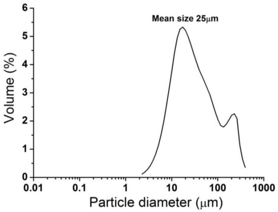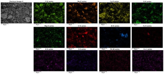 The composition of MSW varies because of differences in lifestyle, so the ash content also varies. Generally, the chemical compositions of the fly ashes showed that SiO2, Al2O3, Fe2O3, CaO, and Na2O were the main oxides (Table 4). Lead and copper were the most common heavy metals in the ashes (Table 5). Based on previous studies, fly ash 1 (Table 4 and Table 5), which has high sodium and chlorine contents, was selected as the fouling matter. The physical and chemical properties of fly ash 1 were examined in more detail. The mean size of fly ash 1 was 25 µm (Figure 2). The elemental concentrations of fly ash 1 as determined by SEM-EDS (Figure 3) were consistent with the results from ICP-OES (Table 4 and Table 5).