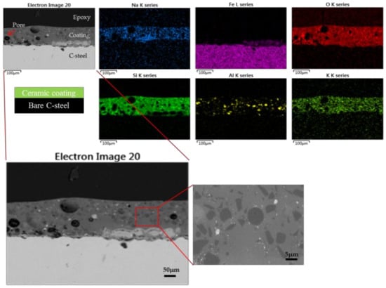 Morphology and EDS maps for the cross-section of the ceramic coating.
