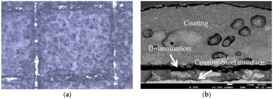 Cross-cut tape test (ASTM D3359) [] was first chosen for qualitative estimation, and pull-off test (ASTM D4541) [] was then carried out to quantify the adhesion of the coatings. In cross-cut tape test, a grid of square scratches was made on the coating surface. Optical microscopy was used to evaluate about the adhesion of the coating. As shown in Figure 6a, the edges of the scratches are completely smooth and none of them is detached. According to standard ASTM D3359, the highest adhesion scale (5B) is referred to the coating. In pull-off test, the adhesive glue used in this work is Araldite 2021 with flexural strength more than 26 MPa. The glued specimens were cured at room temperature for 30 min. The specimens were mounted on testing machine and were pulled in a direction normal to the coating surface at a constant speed 0.013 mm/s until failure occurs. When failure occurs, the maximum load was recorded. As a result, the interface failure occurred in the 27–29 MPa range. Figure 6b shows cross-sectional SEM of coating after the pull-off test. A delamination appeared near the coating–steel interface, i.e., failure surface occurred within the coating. This is referred as a cohesive failure of the coating. Good adhesion of the coating is ascribed to an interdiffusion at the glass-steel interface due to the mobility of some metal ions in the glass and the metal atoms of the steel at high temperature. Metal ions from the glass will diffuse into the metal while metal atoms will diffuse into the glass.