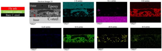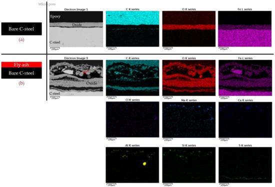 EDS maps for the cross-sectional surface of (a) the non-coated steel without fly ash deposition and (b) with fly ash deposition at 800 °C.