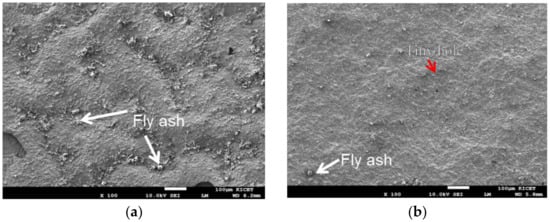 Figure 7a,b present the cross-sections of the non-coated steel plate without and with ash particulate deposited, respectively. As depicted in Figure 7a, bare C-steel experienced breakaway oxidation behavior at 800 °C with the top surface of oxide layer was very intact. On the contrary, in case of exposure with fly ashes (Figure 7b), the top surface of oxide layer was seriously damaged with many hollow blisters. The fly ash adhered strongly to the steel, which rapidly increased the fouling rate. A top view of the surfaces (Figure 8) showed that much ash was attached all over the surface of the non-coated steel (Figure 8a). This suggests that the following chemical reaction takes place between the fouling particulates and steel at high temperatures []:
