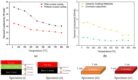 Thermal conductivities of all prepared samples as a function of the temperature up to 800 °C: (a) Specimens with and without ceramic coating; (b) Ceramic coating materials and corrosion specimen.
