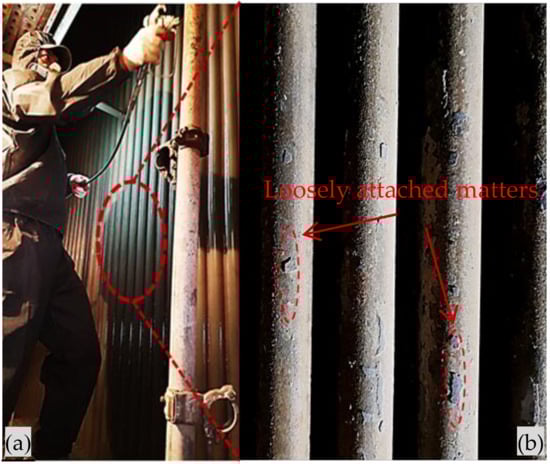 In engineering application, the ceramic coating was applied to the heating surfaces of boiler water-wall tubes of tower 2 at JINJU INDUSTRY power plant in Chungcheongbuk-do province of Korea (Figure 11). The effect of ceramic coating on fouling resistance and energy efficiency was evaluated after 3 months of operation of the boiler. As seen in Figure 11 and Figure 12, a significant difference in the coated and uncoated areas of the boiler surfaces was observed. The coated surfaces were relatively clean with only small amount of unwanted matters attached on a small part of boiler surface. However, it should be noted that, these matters are bonded weakly with boiler surface and they can be easily removed by a low-pressure air gun. Meanwhile, fouling and slagging severely deposited on the uncoated surfaces and it is quite hard to remove them even with a high-pressure air gun.