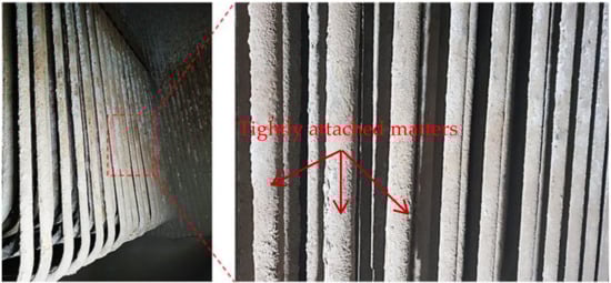 Energy conservation and environmental protection are currently very important issues worldwide. Municipal solid waste (MSW), which is an inevitable product of modern society, is one of the most serious urban pollution sources and one of the greatest challenges for future generations. Deep concerns over global warming have led to numerous studies on energy efficiency and renewable energy []. MSW can be converted to an eco-friendly renewable resource that not only produces energy but also significantly reduces the greenhouse gas emissions from landfills. A waste-to-energy (WTE) incineration plant recovers energy from MSW and produces electricity and/or steam for heating []. For a WTE plant, the energy efficiency can be improved and CO2 emissions be reduced by improving the heat efficiency of the boiler system because this is the main method for heat transfer. However, one of the most serious problems in WTE facilities is that unwanted mineral matter such as slagging and fouling is always deposited on the heating surfaces of the boiler. As a general definition, fouling is the deposition and accumulation of unwanted materials such as scale, algae, suspended solids, and insoluble salts on the internal or external surfaces of processing equipment, including boilers and heat exchangers []. In WTE plants, ash fouling is the result of several physical and chemical processes. Ash fouling, which causes serious corrosion and erosion problems, builds up on the heat transfer surfaces of boilers to act as an insulator; this greatly reduces the global heat transfer of the boiler and minimizes the yield of the plant []. In one study, a typical 1–1.5 mm fouling build-up on the boiler surface can increase fuel consumption by about 3%–8% [,]. In another study, a 0.03 in (0.8 mm) thick fouling layer caused a 9.5% reduction in the heat transfer, and a fouling layer thickness of 0.18 in (4.5 mm) caused a 69% reduction in an extreme case []. When this occurs, the boiler heat transfer surface should be cleaned. However, the operating costs from working to clean fouling is extremely high. Therefore, it is necessary to prevent the deposition and accumulation of unwanted matter on the boiler.