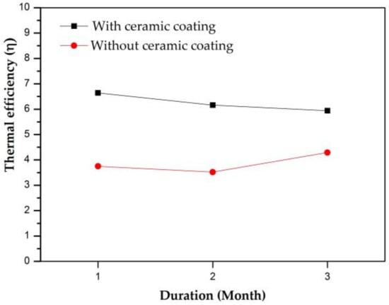 The thermal efficiency of boilers was calculated before and after applying the composite ceramic coating. To do this, it is useful to check the amount of incinerated waste (input amount or burn fuel) and the amount of produced steam (production amount). For simplicity, thermal efficiency (η) before and after using the coating is defined as the rate of total steam production over the fuel consumption. Figure 13 collected the thermal efficiency without and with using the ceramic coating in the same period, respectively. As can be seen in Figure 13, the thermal efficiency increased about 62.34% after applying the ceramic coating. Of course, there are some other operating conditions can affect the result, but it is worth concluding that the developed ceramic coating has great potential to be applied in real boiler systems to improve their overall thermal efficiency.