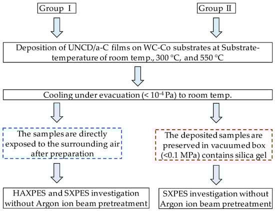 The samples were divided into two groups according to a difference in the storage procedure after deposition. The difference is schematically shown in Figure 1. The samples of Group I were exposed naturally to surrounding air for a maximum of two weeks after finishing deposition by CAPD apparatus and until HAXPES and SXPES measurements were made. On the other hand, the samples of Group II were preserved in a portable vacuum box containing silica gel, where the inside pressure is less than 0.1 MPa, as soon as they were taken out of the CAPD apparatus, for a maximum of two weeks. Moreover, they were quickly set into an SXPES vacuum apparatus before measurements were taken.
