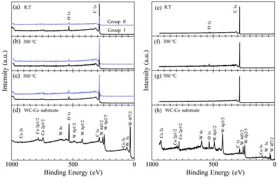 Soft X-ray photoemission spectroscopic (SXPES) survey (a–d), and hard X-ray photoemission spectroscopic (HAXPES) survey (e–h), of Group I ultrananocrystalline. diamond/amorphous carbon (UNCD/a-C) films deposited at substrate temperature of room temperature (R.T.), 300 °C, and 550 °C, and WC-Co substrate.