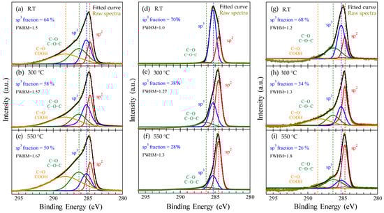 Figure 3 shows the C 1s spectra of Group I samples (a), (b), and (c), measured by SXPES and (d), (e), and (f), measured by HAXPES, and Group II samples (g), (h), and (i), measured by SXPES. Macroscopically, the maximum energy of the spectra shifts to a higher binding energy with decreasing substrate temperature, which is particularly evident for Group I spectra measured by HAXPES and Group II spectra measured by SXPES. The shifts might have occurred due to the enhancement of the sp3 bonding fraction [], which is consistent with hardness increasing as substrate temperature decreases.