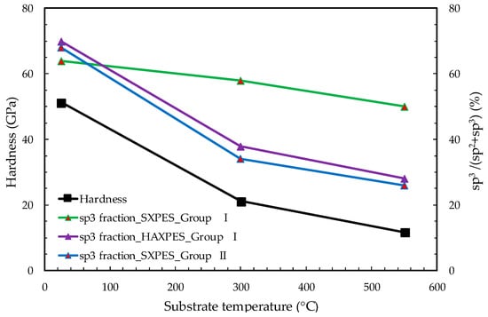 The sp3 peaks show a relative decrease as substrate temperature increases. The HAXPES technique produces sharp and intense sp3 peaks with a noticeable difference compared to the sp2 peaks, unlike those obtained by SXPES for Group I samples. The Group II samples preserved in the vacuum box produced relatively consistent peaks, compared to those revealed by HAXPES. Figure 4 shows the substrate temperature dependence of the hardness and sp3 bonding fraction. The dependence profile of the sp3 bonding fraction estimated from HAXPES and SXPES for Group II samples are in good agreement, not only with each other but also with the hardness dependence profile. This means that the estimation of the sp3 fraction is precise, since the hardness proportionally increases with the sp3 fraction [,]. On the other hand, the substrate temperature dependence profile of the sp3 fraction estimated from SXPES for Group I, obviously deviates from that of hardness. Estimation of the sp3 bonding fraction is also affected by the existence of C–O/C–O–C and C=O/COOH peaks. The SXPES investigation for Group I emphasizes that the presence of undesirable contaminants on the films surface could lead to difficulties in obtaining surface functionalization. Therefore, the HAXPES method and demonstrating a careful methodology for SXPES investigation, are recommended when assessing the sp3 bonding fraction to UNCD/a-C films and nanomaterials.