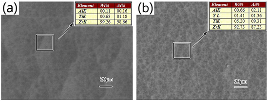 SEM morphologies and surface chemical composition of the alloying coatings: (a) Zr; (b) Zr-Y.