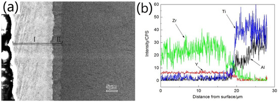 As-deposited Zr coating was uniform (see Figure 2a), and the uneven particles and bulges were homogeneously dispersed and distributed on the surface of the modified layer. EDS analysis indicated that the surface was composed mostly of Zr and small quantities Ti and Al. Zr-Y coating was silver in color and looked smooth and dense and demonstrated uniform crystallinity. We believe that the addition of Y stimulated nucleation of crystal grains. Finer grains suppressed abnormal grain growth and reduced presence of micropores. EDS showed that the surface of the Zr-Y coating mainly contained 1.41 wt % of Y, 5.20 wt % of Ti and 92.73 wt % of Zr. This composition indicated significant deviation from the composition of the Zr-Y target. One explanation could be formation of infinite solid solution between Ti and Zr since their crystal structures are very similar. Another reason for this deviation could be the difference between Zr and Y sputtering energy, which affected how much of each element was actually sputtered. The thickness of the Zr-Y coating was ~25 μm (see Figure 3). The coating consisted of an outer deposition layer (zone I) and an inner diffusion layer (zone II).