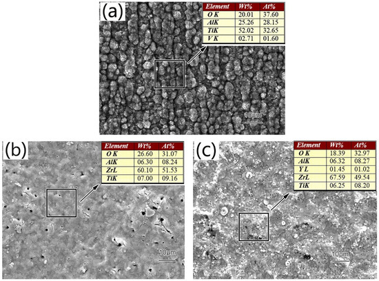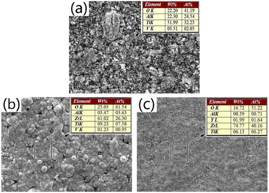 As the temperature increased, nucleation rates of the oxide grains on the TiAl surface substrates increased (see Figure 9a). Therefore, grains became smaller and the number of cellular particles decreased. Al content in these cellular particles was above average according to the EDS analysis. The oxidation layer of the Zr coating demonstrated abnormal grain growth and some cracks (see Figure 9b). Therefore, surface defects of Zr-film associated with the oxidation process increased with temperature, diminishing its oxygen blocking effect and further aggravating the oxidation process. However, Zr-Y coating remained relatively intact during the oxidation process mostly because of the formation of fine grains associated with the presence of Y (see Figure 9c). Oxidized Zr-Y coating demonstrated no abnormal grain growths, voids, or cracks. A surface energy spectrum analysis diagram showed only Zr and O as main constituents of the oxidized film. Because Y atoms occupied grain boundaries and other defects, cations in the underlying substrate were effectively prevented from diffusing toward the surface [24,25].