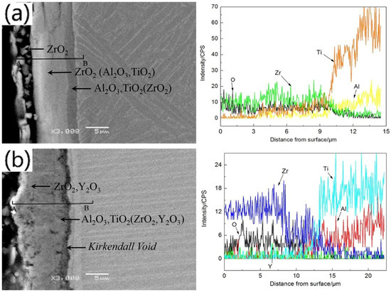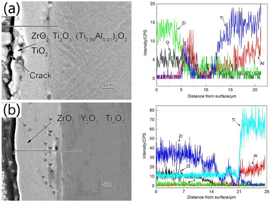No obvious stratification of the oxidized Zr-Y film was observed (see Figure 7b). However, judging by the EDS analysis, it had two layers with different compositions. The outer layer was ~10 μm thick and consisted of ZrO2 and Y2O3 bubble-like oxidized film. The inner layer consisted of Ti4O7 and Al2O3. Due to the thermal stresses and different diffusion rates of metals, Kirkendall voids formed between the oxidized film and the substrate [22]. Al atoms near the substrate diffused into the oxidized film forming amorphous alumina layer under the oxidized film.