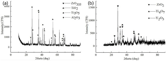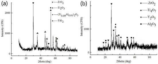 The surface of the oxidized Zr coating was mainly composed of ZrO2 and small amounts of TiO2 and Al2O3 (see Figure 5a). TiO2 and Al2O3 diffraction peaks were weaker than that of ZrO2, thus, formation of ZrO2 on the surface of the oxidized film could effectively inhibit TiO2 formation, demonstrating good oxidation resistance. Oxidation products of the Zr-Y coating were mainly ZrO2 Y2O3 and Al2O3, as well as small amount of Ti4O7 (see Figure 5b). No TiO2 was detected. The appearance of Ti4O7 indicated that the Zr and Y elements reacted faster with oxygen preventing it from diffusing into the layer to fully oxidize Ti atoms.