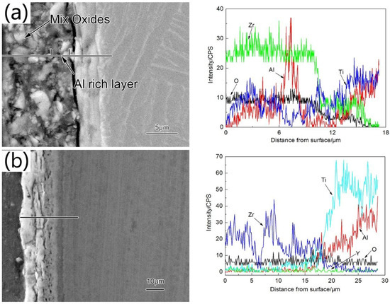 The surface of the oxidized Zr coating had more obvious cellular granular growth. The oxidized Zr surface showed numerous deep cracks. As the cracks propagated, the oxidized film started bubbling and peeling off. The outer layer of the oxidized coating was ~10 μm, had loose structures and uneven grain sizes, and completely separated from the substrate. Al concentration was the highest at ~7.5 μm away from the surface (Figure 13a). We believe that diffusion of O, Al and Ti through the intermediate layer led to this complex morphology. Part of the alloy below the oxidized layer contained a lot of dissolved oxygen, leading to severe embrittlement [14]. At 850 °C, oxidation resistance of Zr coating degraded rapidly, and such Zr-coating would not be able to provide adequate protection to the γ-TiAl alloy.