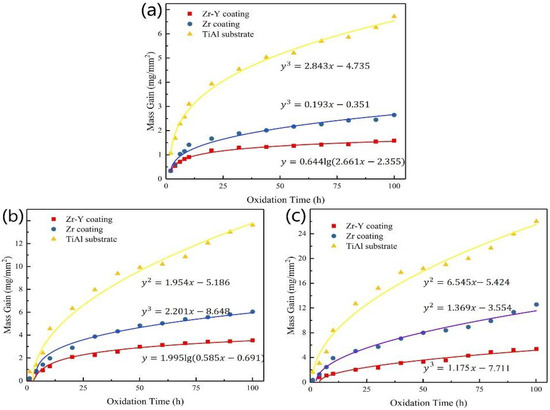 Oxidation kinetic curves of bare and Zr and Zr-Y-coated γ-TiAl substrates at 750 °C, 800 °C, and 850 °C are shown in Figure 14. Both coated samples displayed better oxidation resistance than the bare γ-TiAl substrate. Performance of the Zr-Y alloying coating was superior to that of Zr coating.