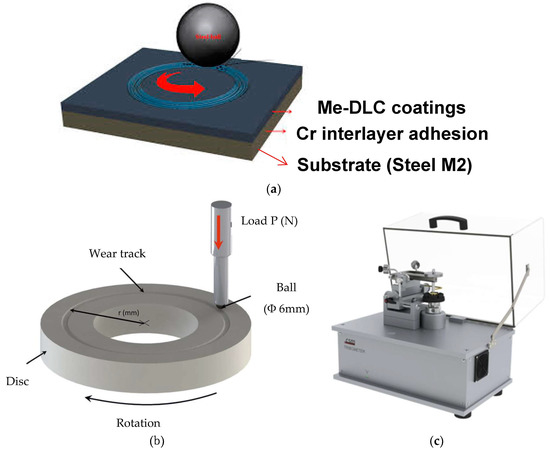 Ball-on-disc configuration friction test (a,b) and view of test apparatus (c).
