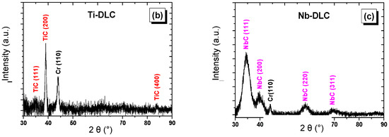 Figure 3 shows XRD spectra corresponding to Me-DLC (Me = Al, Ti or Nb) coatings grown on glass substrates. Only the heavily doped coatings reveal a crystallized phase (Al, TiC, NbC). For the three coatings Al-DLC, Ti-DLC, and Nb-DLC, the peak corresponding to the Cr (110) position at approximately 44.388° is associated with the adhesion Cr interlayer. As expected, the Al (111) peak of metallic aluminum is detected at about 2θ = 38.562° (Figure 3a). Aluminum is poorly crystallized and it is embedded in the amorphous carbon matrix in its metallic form. For Ti-DLC and Nb-DLC coatings, metal carbides phases of cubic structure were observed, as shown in Figure 3b,c, respectively. As reported in other work, TEM analyses have indeed revealed that the samples consisted of amorphous structures containing nanometric metal grains [50], as well as nanocrystals of crystalline cubic metal carbide phases [51]. No crystalline structure was detected in our coatings with less metal, which are solid solutions of metal in the amorphous phase. TEM analysis should be carried out to confirm the XRD results.