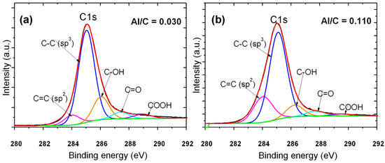 C1s XPS spectra of (a) undoped DLC and Al-DLC coatings: (a) Al/C = 0.030 and (b) Al/C = 0.110.