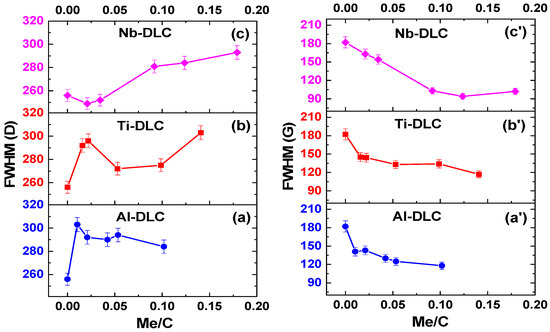 Evolution of Full Width at Half Maximum (FWHM) (D) and FWHM (G) as a function of Me/C of (a,a’) Al-DLC, (b,b’) Ti-DLC, and (c,c’) Nb-DLC coatings, respectively.