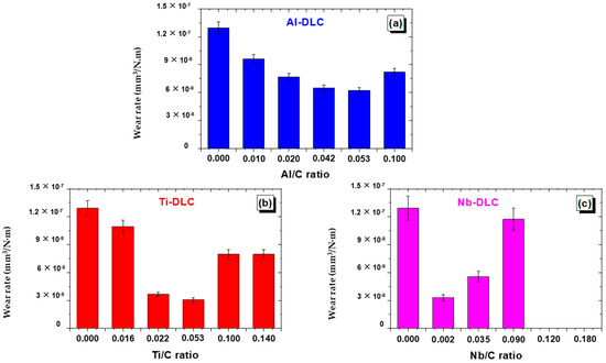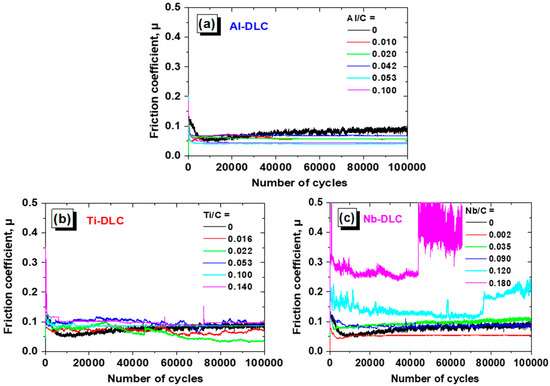 Figure 11 shows the friction behavior of Me-DLC as compared with that of undoped DLC. In the case of aluminum, a significant improvement in the coefficient of friction is observed for all Al-DLC coatings and the lower value is measured at 0.04 (Figure 11a). Moreover, profiles show a great stability of the friction coefficient from the first cycles to the end of the tests. These values are lower than that of undoped DLC (µ = 0.07). The friction profiles of Ti-DLC coatings (Figure 11b) reveal a more or less stable behavior and show an improvement in the case of Ti/C = 0.022. Like for Ti-DLC coatings, Nb-DLC coatings show a decrease in friction coefficients for a weak Nb doping (Figure 11c). For higher Nb contents, (Nb/C = 0.180, for example), the coefficient of friction increases and becomes higher than that of the undoped DLC. The average friction coefficient of DLC coatings decreases when low metal element concentrations are incorporated into the carbon matrix. Then, for higher levels, the coefficient of friction continues to decrease in the case of Al-DLC coatings, while it begins to increase for Ti-DLC and Nb-DLC coatings.