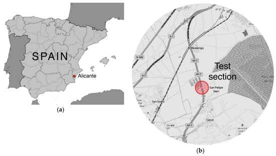 For this piece of research, an in situ test section was set on the CV-904 rural two-lane highway from Crevillente to Catral, located at the existing intersection on 4 + 400 kilometric point (KP), in the municipality of Catral, province of Alicante, Spain (see