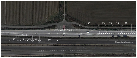 Figure 2, stripes were painted in pairs (except the first one, that is just one stripe), spaced 15 m between groups, except for the single stripe, that is 20 m apart. The last stripe is 50 m away from the intersection, considered as a conflict point.