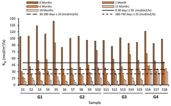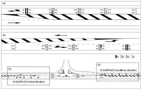 We have tested the fundamental parameters of the in situ testing samples: (i) luminance factor β and colour (chromatic coordinates X,Y) for daytime visibility, using a Spectro-Guide 45/0 gloss spectrophotometer (BYK GmbH, Wesel, Germany); (ii) retroreflective luminance coefficient (retroreflectivity) in dry (RL) and wet conditions (RW) for nighttime visibility, using a ZRM 6013 retroreflectometer (Zehntner GmbH, Sissach, Switzerland); and (iii) skid resistance coefficient (SRT) using the TRRL pendulum (Controls SpA, Milan, Italy). All the tests were performed inside the wheel path area. As standards require, each factor was measured a minimum of three times in every testing sample per driving direction, and subsequently the average value is calculated. Therefore, for each kind of mixture tested (S1–S18), at least six values for each parameter and period of time assessed were determined.