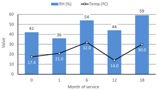For the durability study, we have measured those parameters at different times: just produced, after 1, 6, 12, and 18 months, for a quantitative and qualitative analysis supported by data charts, pictures of in situ testing samples and laboratory specimens using a Leica EZ4D microscope (Leica Microsystems GmbH, Wetzlar, Germany). The weather conditions during data collection are shown in