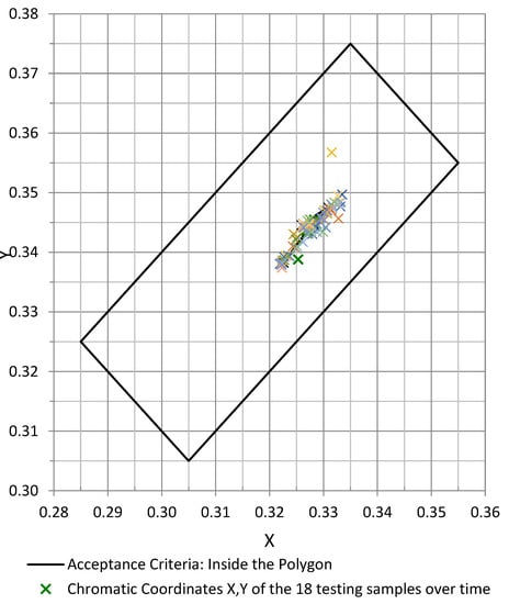 Y) measured on the 18 in situ testing samples over time. The results obtained are all inside the colour polygon defined by its vertices for the white permanent colour, hence this parameter is not a limiting condition according to the aspects studied in this paper.